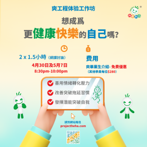 爽工程于2024年4月30日及5月7日舉辦了一場在線的Zoom體驗工作坊,與參與這樣一起探討如何利用爽工程的理念和工具,轉化壓力、改善拖延以及突破自我。
